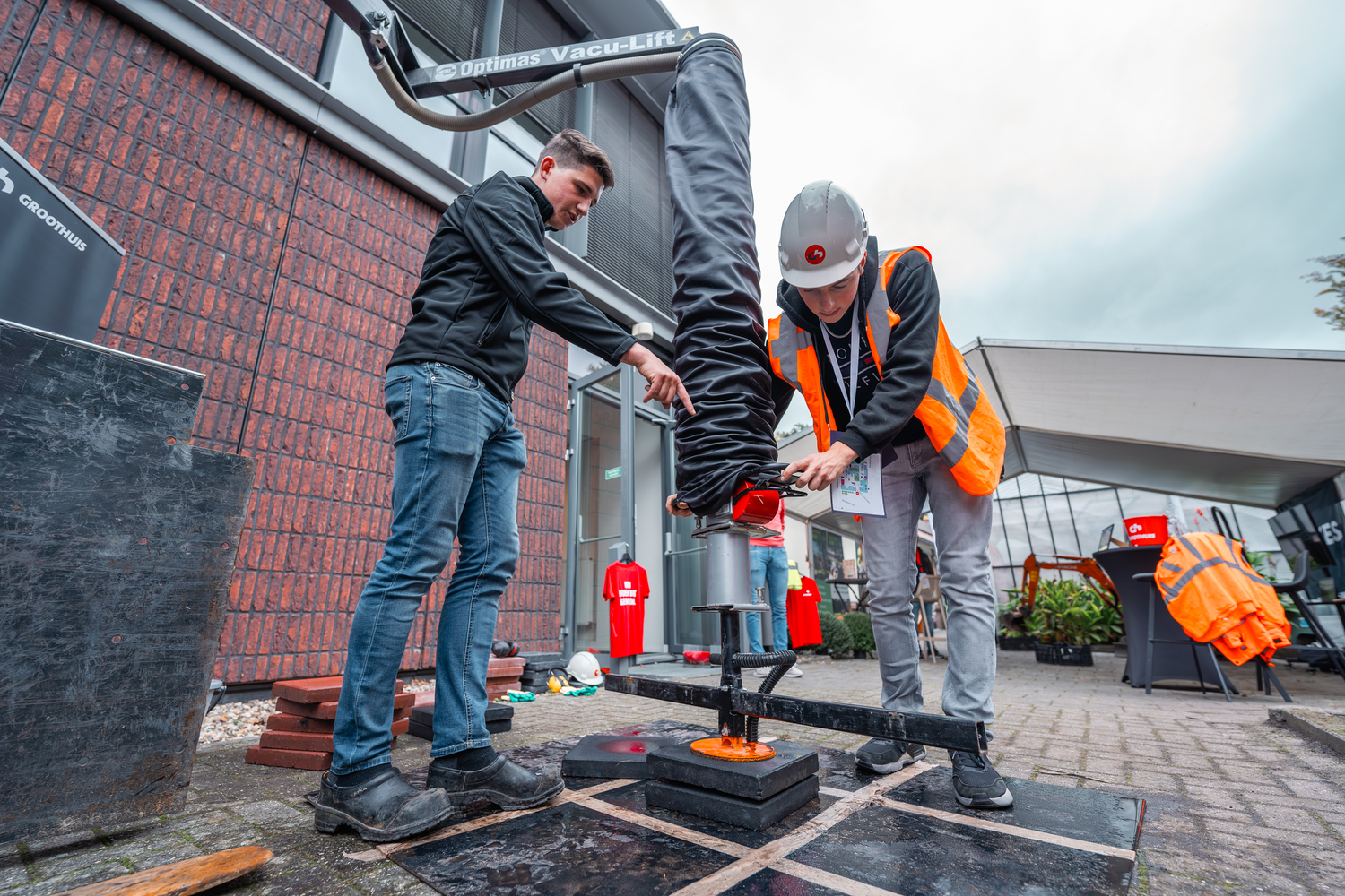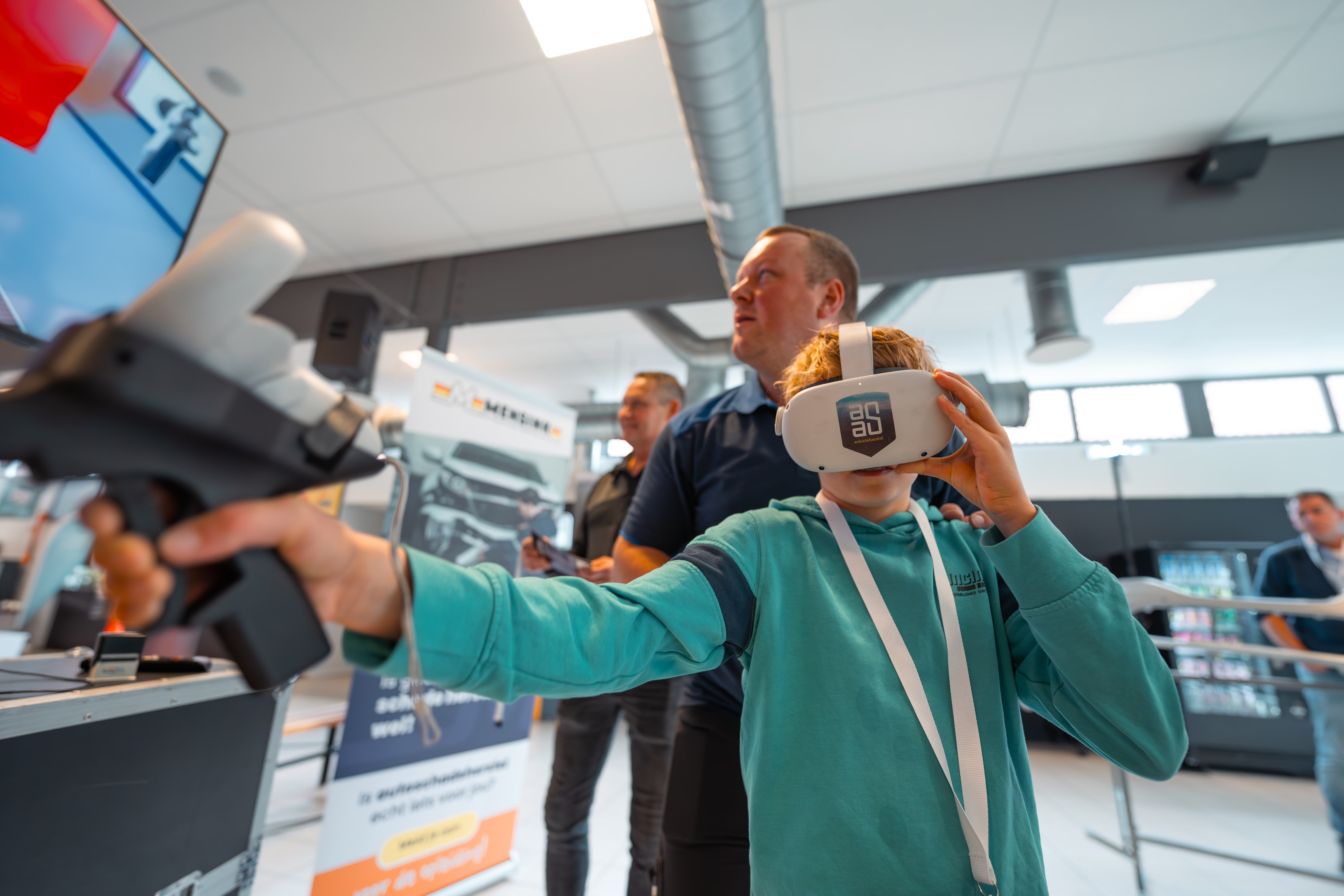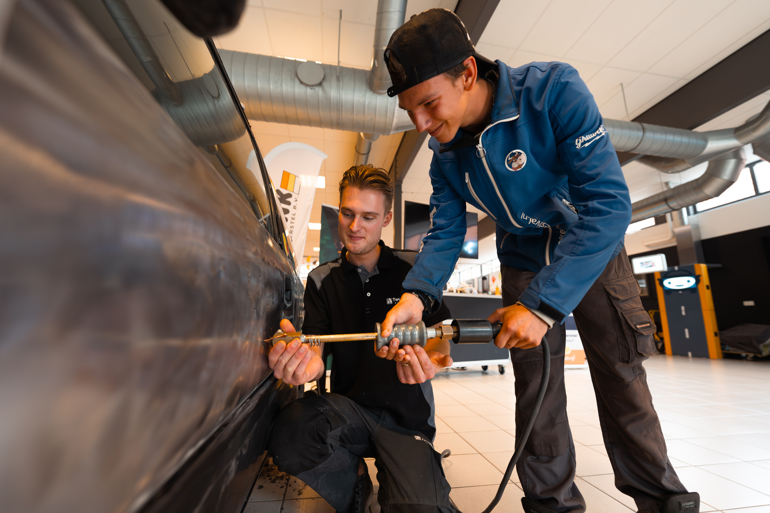 Mensink Autoschadeherstel uit Tubbergen liet de leerlingen op volle kracht een deuk in een auto slaan. Vervolgens leerden zij hoe je die deuk er weer uit haalt met een spotter, uiteraard met steeds een veiligheidsbril op. Veel leerlingen wilden eerst 100% zéker weten dat ze mochten slaan met de hamer, en gooiden er vervolgens al hun kracht tegenaan. Naast de leerlingen laten zien wat uitdeuken is, konden ze bij Mensink Autoschadeherstel ook aan de slag met Virtual Reality lakspuiten.
