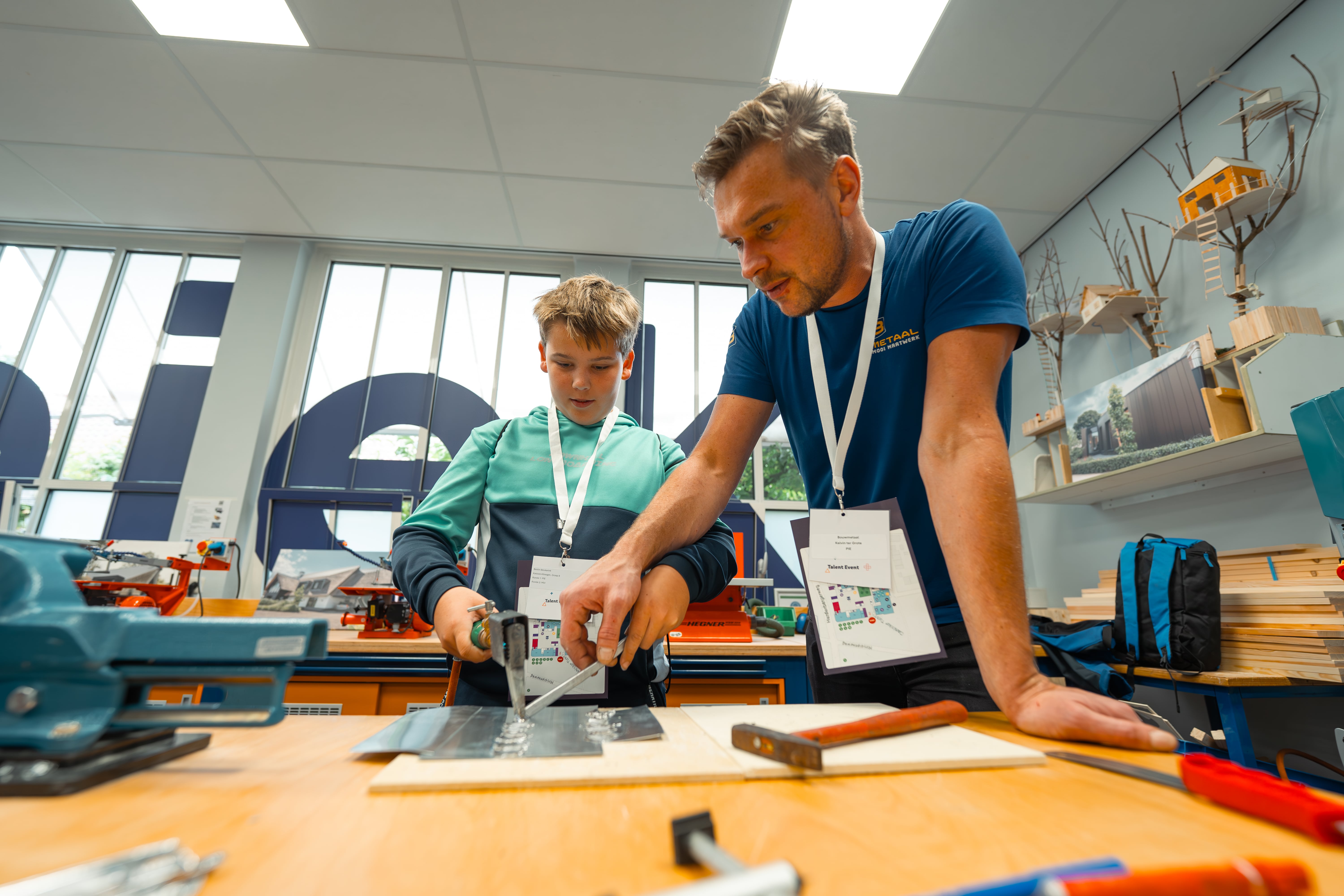 Werner Scheuten is praktijkdocent bij SMEOT: “Uiteraard stonden we hier ook! We lieten de leerlingen zien wat verspaning is, hoe draaien en frezen werkt, en ook hoe programmeren daarin een rol speelt. Uiteraard gingen de leerlingen er onder begeleiding mee aan de slag. Waarom we speciaal verspaning lieten zien? Voor deze discipline is steeds minder belangstelling en instroom, dus besloten we specifiek aan de jeugd verspaning te presenteren tijdens dit mooie Talent Event.” In een andere stand van SMEOT maakten de leerlingen een sierlijke plantenhanger door metaal te lassen. De po-leerlingen waren onder de indruk. Remy: “In Geesteren heb ik eerder ook mogen lassen en nu weer. Het is best spannend!”
